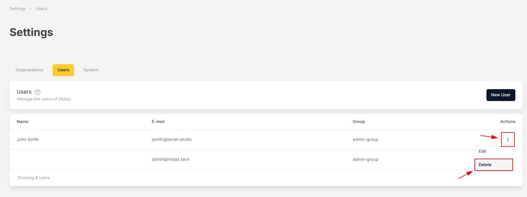 Figure 6. The option to delete a user from the Actions menu.