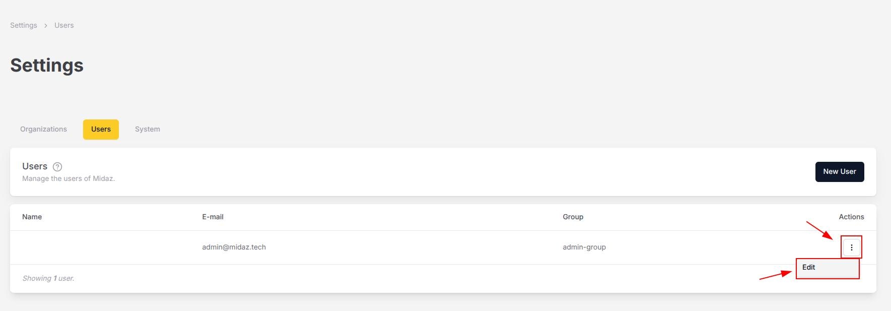 From the Users page, find the user that you want to edit, click the three dots () from the Actions column, and select Edit.